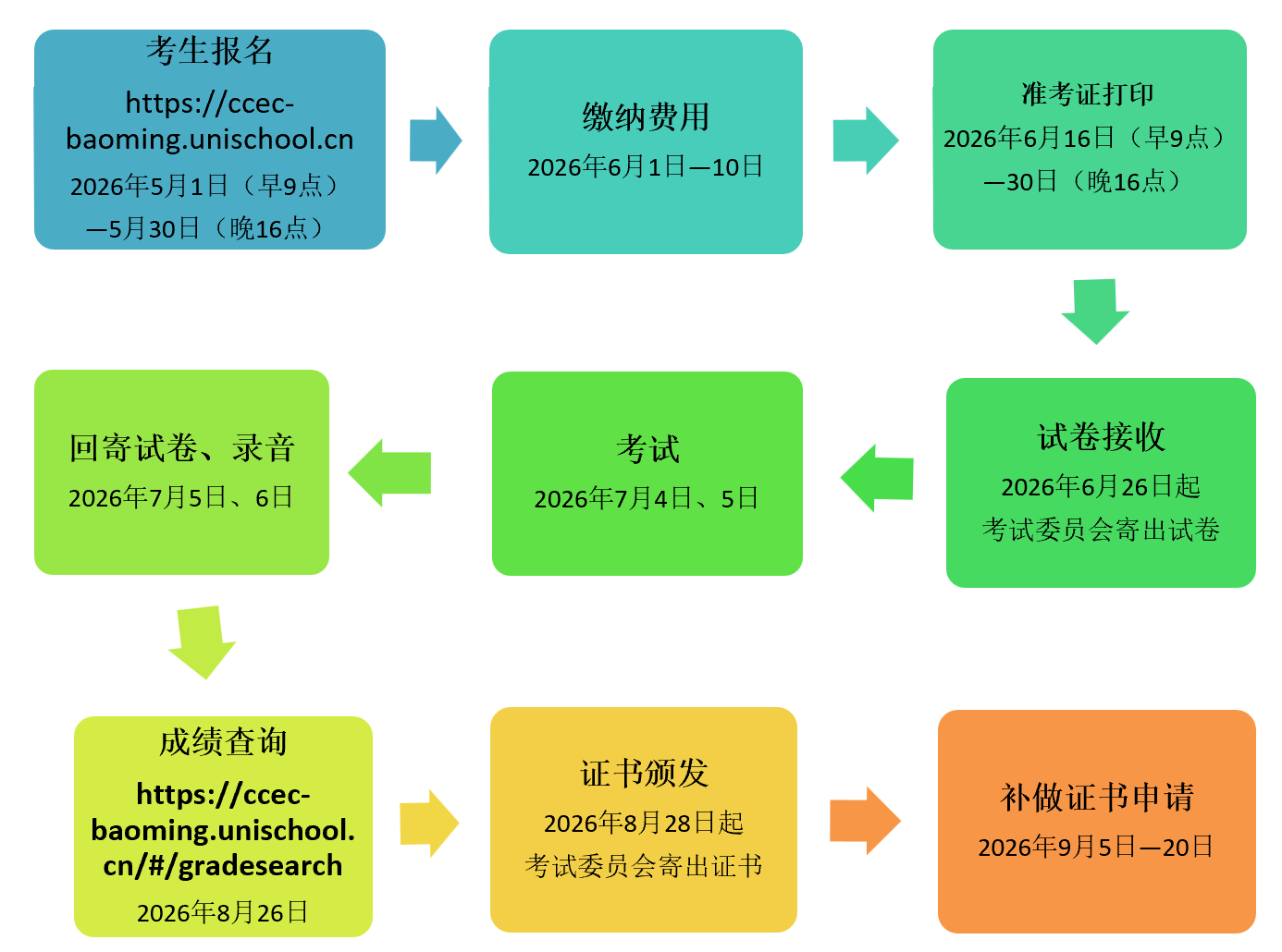 考点向网上报名系统录入信息时间:2026年5月6日(早9:00起)—5月30日(晚16:00止)